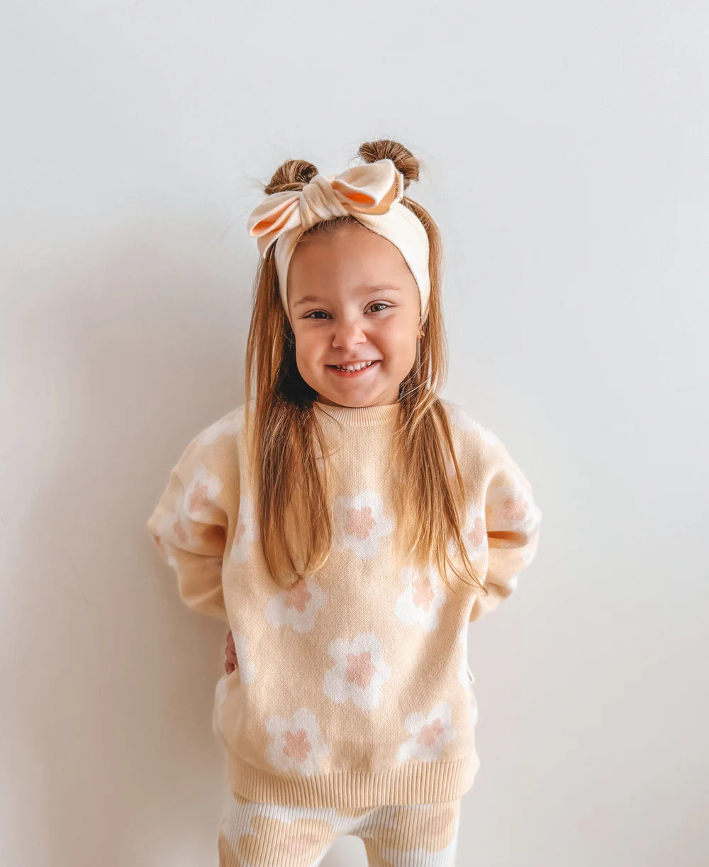 Our new Daisy floral knit jumpers are super soft, cosy and made from 100% breathable cotton. Bloomers, leggings and headbands sold separately for the complete outfit.