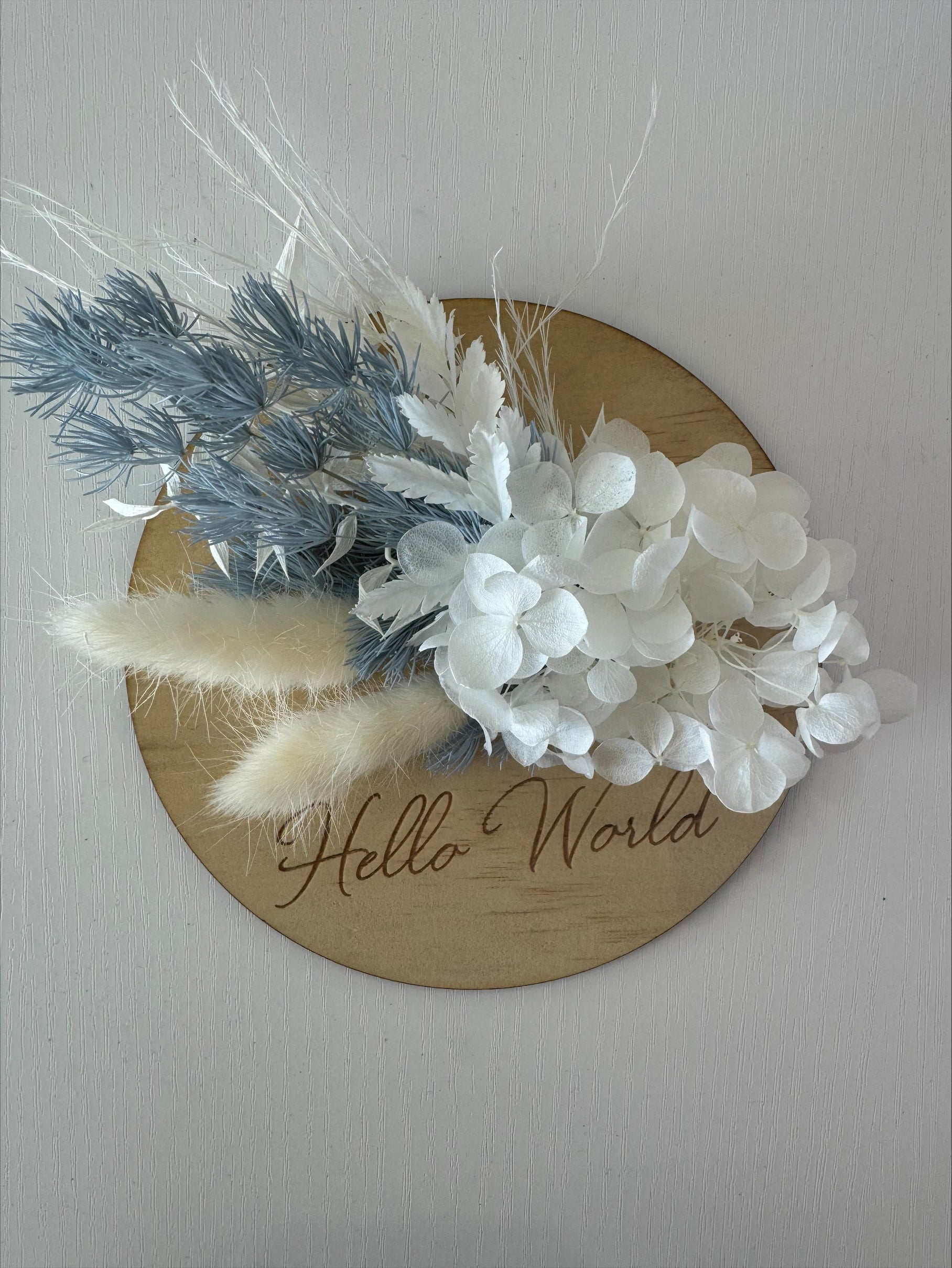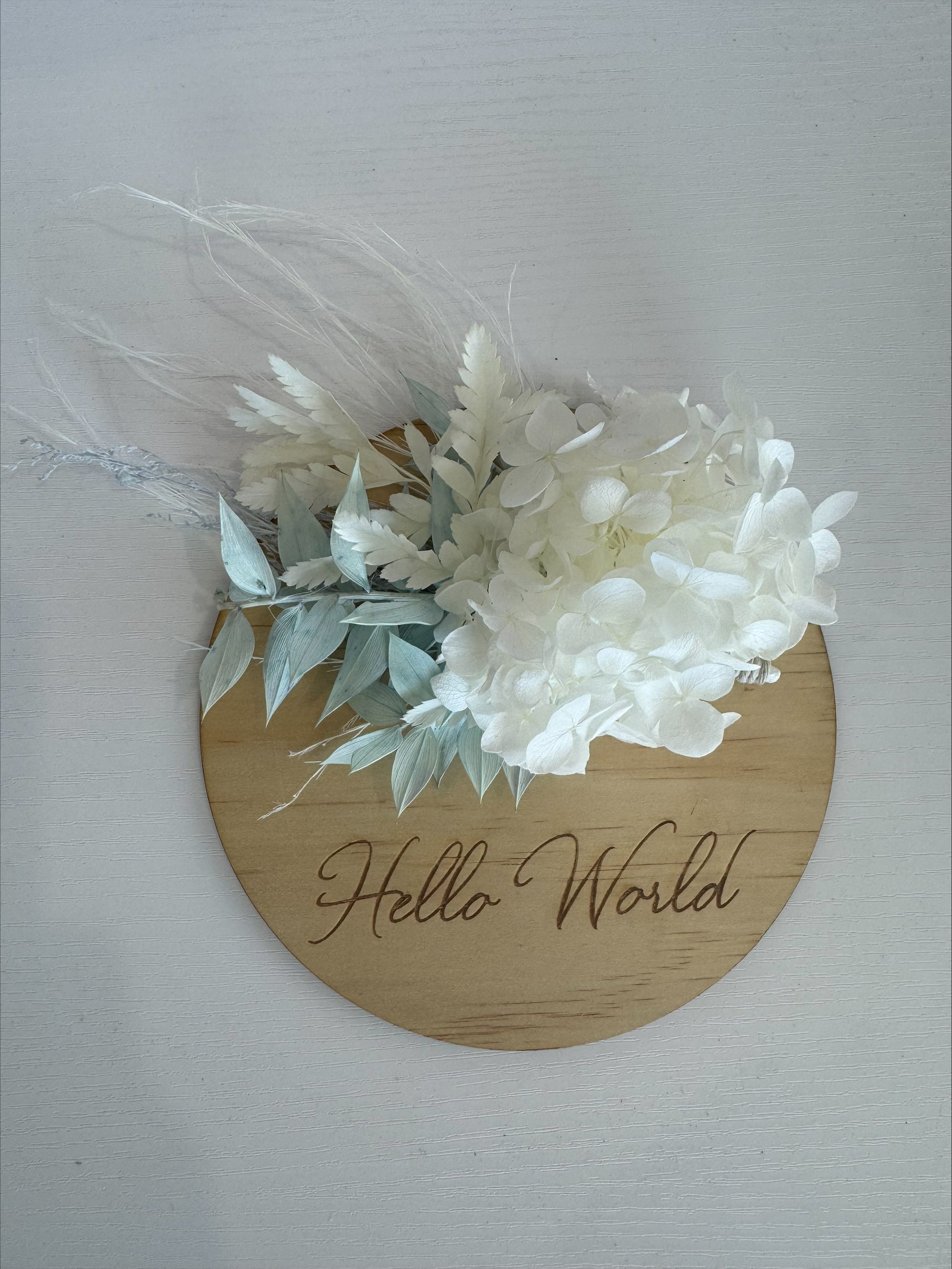 Looking for a unique way to announce the birth of your bundle of joy? Why not a Hello World birth Announcement Plaque with dried flowers to create the sweetest announcement photo!